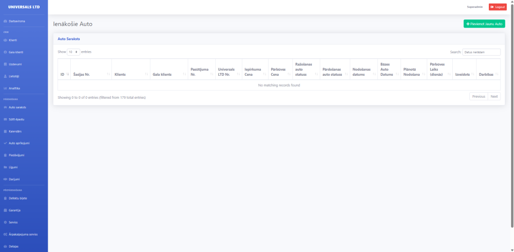 - Pārdošana - auto saraksts, kalendārs, piedāvājumi, līgumu un darījumu pārvaldība, aprīkojuma konfigurēšana.
